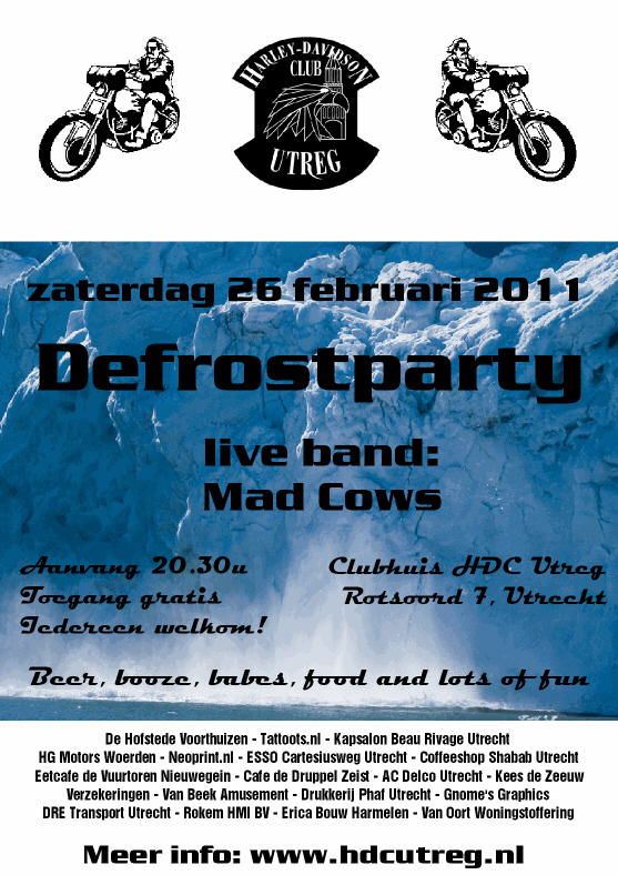 De jaarlijkse Defrostparty in het clubhuis van HDC Utreg: Meer info op http://www.hdcutreg.nl Dit bericht is gewijzigd door DOmbo op 26-01-2011 @ 0:22 Indien je ingelogt bent, kan je je aanmelden voor dit evenement. Bovendien kan je meer informatie opvragen en zien wie zich ook heeft aangemeld voor dit evenement. Via deze weg kan je je vrienden zoeken en nieuwe vrienden maken.
