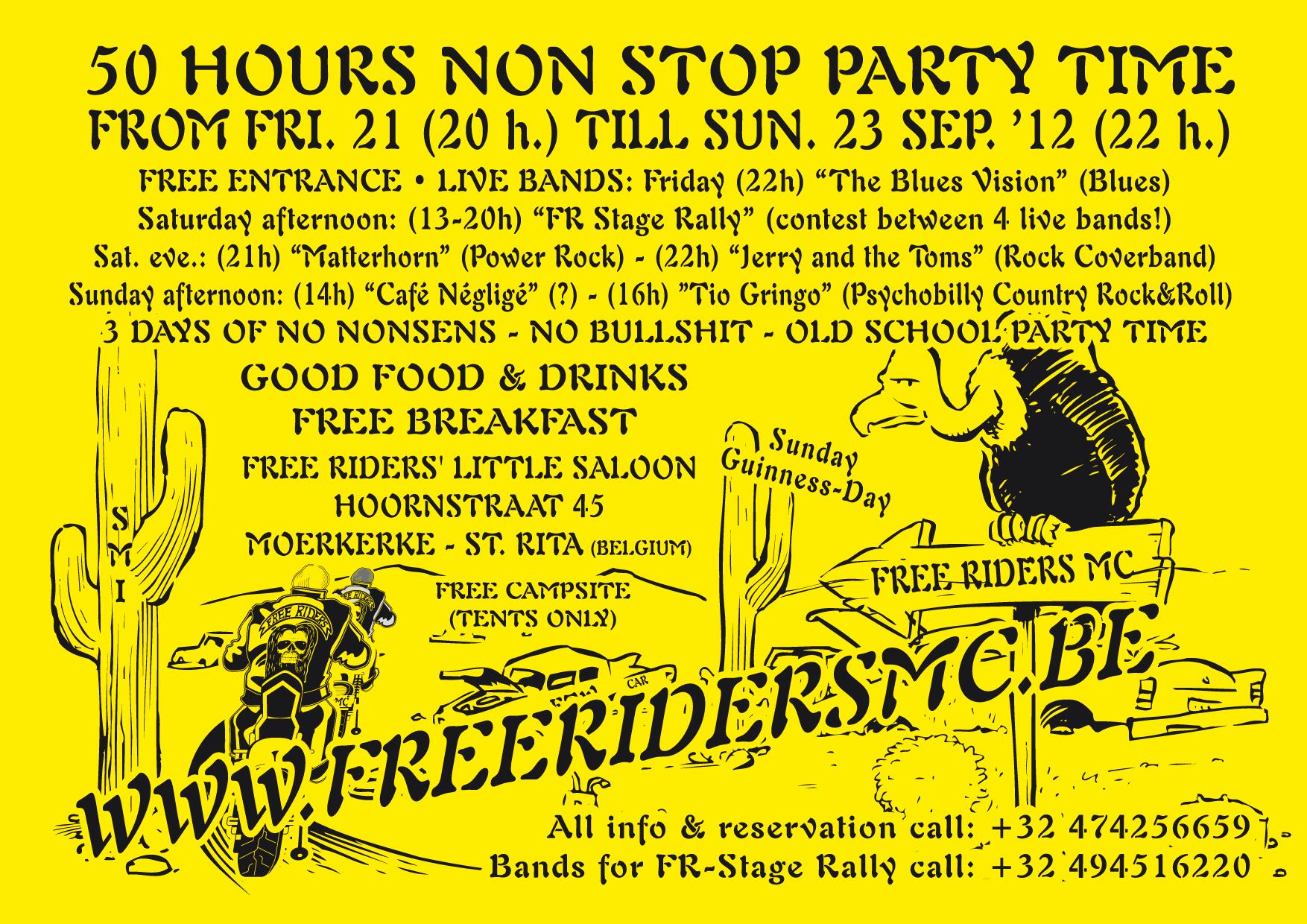 Hey, vanaf 21/9 om 20u tot 23/9 tot 20u is het weer tijd voor de jaarlijkse 50-uren van de Free Riders MC. Non-stop drank en eten verkrijgbaar en verschillende optredens met oa. een Stage Rally op zaterdagnamiddag. Gratis ingang en gratis campeerplaats voor tenten. Ook is er de zaterdag en zondag gratis ontbijt voorzien. Place to be: Hoornstraat 45 Moerkerke - St. Rita Indien je ingelogt bent, kan je je aanmelden voor dit evenement. Bovendien kan je meer informatie opvragen en zien wie zich ook heeft aangemeld voor dit evenement. Via deze weg kan je je vrienden zoeken en nieuwe vrienden maken.
