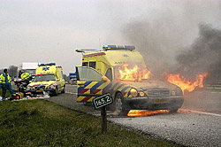 --Het verhaal dat bij de foto hoort-- Ambulance in brand bij spoedoverplaatsing 7 februari 2004 Een ambulance die met spoed op weg was naar Antwerpen is vrijdagmiddag uitgebrand. Op de A58 van Vlissingen naar Bergen op Zoom ontstond ter hoogte van Arnemuiden brand in het motorblok. Beide ambulancemedewerkers en de patiënt die zij vervoerden, konden op tijd uit de brandende auto komen. Door de grote rookontwikkeling moest de politie de A58 vanaf de afrit Nieuw- en Sint Joosland afsluiten. De wagen heeft grote schade opgelopen. Bronnen: Omroep Zeeland - HVZeeland.nl Foto: Kees Marijs niets is toeval.... AnneMarie